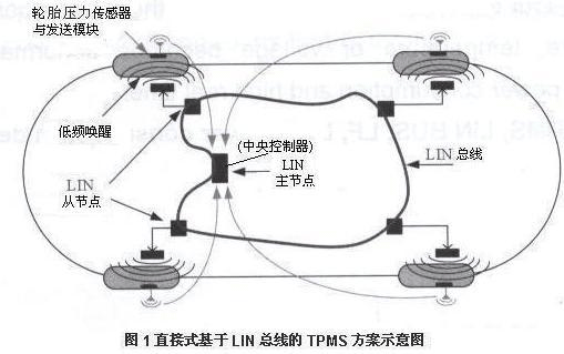 由于將研討LIN總線應(yīng)用于TPMS,并用MCU、RF和傳感器實(shí)現(xiàn)TPMS見(jiàn)圖1直接式基于LIN總線的TPMS方案示意圖。而實(shí)用 TPMS示意的輪胎氣壓監(jiān)測(cè)系統(tǒng),是由與輪胎閥一體的4個(gè)訊號(hào)發(fā)射器、收訊天線、收訊器及訊號(hào)顯示儀四類部件組成的。為此有必要先對(duì)汽車應(yīng)用的LIN總線有關(guān)技術(shù)作介紹。