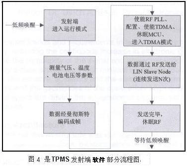 在設(shè)計(jì)一個(gè)運(yùn)行穩(wěn)定、功效高的系統(tǒng)時(shí),需要考慮的第一個(gè)因素就是軟件。因?yàn)檐囕喣K通常是用微控制器來(lái)執(zhí)行命令的,所以應(yīng)采用一種智能化算法實(shí)現(xiàn)預(yù)期的功效。其次,使用低頻功能是控制TPMS的非常有效的方法。在使用低頻接口時(shí),感應(yīng)模塊可以始終處于電源關(guān)閉模式,只有在收到喚醒信號(hào)后,傳感器才會(huì)進(jìn)行測(cè)量和數(shù)據(jù)傳輸。除了降低功耗以外,低頻接口還具備設(shè)計(jì)靈活性和其他一些優(yōu)勢(shì)。例如,低頻通訊可使系統(tǒng)通過(guò)低頻接口向微控制器發(fā)送特定命令,以對(duì)輪胎進(jìn)行重新校準(zhǔn)和定位。值此以MLX90603帶有LF(Low Frequency)接口為例的發(fā)送模塊軟件設(shè)計(jì)方案作一說(shuō)明。MLX90603帶有LF(Low Frequency)接口,因此可以在大部分時(shí)間內(nèi)將發(fā)射端處于休眠模式,需要時(shí)通過(guò)低頻信號(hào)將其喚醒,進(jìn)而進(jìn)行測(cè)量并通過(guò)TH720x發(fā)射芯片將測(cè)量得到的數(shù)據(jù)發(fā)送給相應(yīng)的LIN從節(jié)點(diǎn)。圖4是發(fā)射端的部分流程圖。本方案中,充分利用了MLX90603 中集成的TDMA(Tag Direct Memory Access)模塊,在MLX90603采集完數(shù)據(jù)后,配置TDMA、RF所需的寄存器,即可將MLX90603進(jìn)入Sleep mode,利用TDMA模塊自動(dòng)把要發(fā)射的數(shù)據(jù)傳輸給RF,以充分節(jié)省功耗。由于發(fā)射端工作在惡劣環(huán)境下,為了保證發(fā)送端和接收端進(jìn)行可靠的數(shù)據(jù)傳輸,考慮到本應(yīng)用信息量小、數(shù)據(jù)簡(jiǎn)單的特點(diǎn),我們采用信息冗余的方法來(lái)保證數(shù)據(jù)的可靠接收,即一幀數(shù)據(jù)發(fā)送N次。根據(jù)采集到的數(shù)據(jù)動(dòng)態(tài)調(diào)整發(fā)送次數(shù)N。
