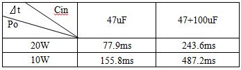 從上可以得知,AC-DC電源內部輸入的濾波電容Cin、DC-DC部分最低工作電壓以及效率都無法改變,所以電源本身的掉電保持時間無法改變。假如想增加掉電時間,可以在電源前端再接一級整流濾波,外接的濾波電容與電源內部的輸入濾波電容是并聯關系,這增加了Cin,從而增加掉電保持時間。也可以選取大的輸入電容,其次輸出電容是無影響的,輸入電容以及負載關系和掉電保持時間表如下圖所示: