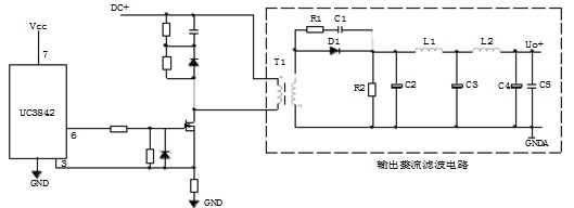 上圖為反激式輸出整流濾波電路:T1為開關變壓器,其初極和次極的相位相反。D1為整流二極管,R1、C1為削尖峰電路。L1為續流電感,R2為假負載,C4、L2、C5組成π型濾波器。