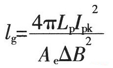 4、變壓器的氣隙lg如上式:Ae為磁芯的有效截面積(cm2),△B為磁芯工作磁感應強度變化值(T),Lp單位取H,IPK單位取A,lg單位為mm。