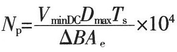 6、變壓器原邊匝數NP如上式:△B為磁芯工作磁感應強度變化值(T),Ae單位為cm2,Ts單位為s。