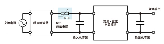 交流轉直流電源模塊是指由交流-直流整流電路、直流-直流轉換器及少量元器件組成的小型開關電源,接一個NTC熱敏電阻可以有效地抑制在通電時施加到輸入和輸出電容上的浪涌電流。如下圖所示: