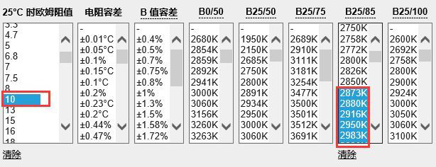 如上圖所示:其中B0/50、B25/50、B25/75、B25/85、B25/100分別對應不同溫度之間的B值。假設溫度25度時阻值為10,當溫度為85度時阻值為2,帶入等式中可以得到B值需要2864K以上。