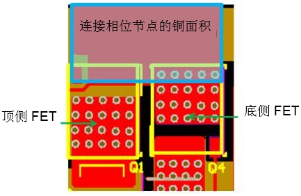 上圖所示為將頂部和底部分立MOSFET并排連接時的銅軌道,這是可將電機繞組連輕松連接到PCB的常見布局之一。連接相位節(jié)點的銅面積的長度為寬度的兩倍(軌道寬度取決于電流,軌道寬度通常受電路板的外形尺寸限制)。或者您可以上下排列頂側和底側分立MOSFET,保持在相位節(jié)點之間。但是由于需要提供將電機繞組連接到相位節(jié)點,您可能無法減少軌道長度,并且這種布置可能不適合所有應用。