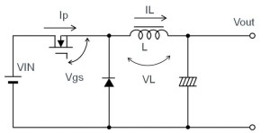 模式幾乎和正激方式相同,只是去掉正激方式的變壓器,將D1換成MOSFET。MOSFET為ON時,電流經過電感流向負載端,同時電感也蓄積電能。此時,二極管為OFF。MOSFET為OFF時,蓄積在電感的電能經由二極管D2供給至負載端。和正激轉換器的D1相同,開啟或關閉MOSFET。
