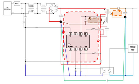 紅色線是大電流路徑,是發生振鈴或損耗主因,應盡量粗盡量縮短。此外,紅色線的環路盡量縮小。二次側的橙色線和紅色線相同盡量粗盡量縮短、環路盡量縮小。褐色線是電流流向VCC引腳的路徑,開關時流通電流,故須個別配線。變壓器的正下方會受到磁通影響,不可經過IC控制信號線。紅色線、褐色線、藍色線、緑色線的GND應有一點接地。緑色線是二次側的浪涌流向一次側的路徑,會瞬間流過大電流,因此在紅色線和藍色線之外個別配線。藍色線是IC控制信號用GND線,不會流過大電流,但容易受到噪聲影響,因此須在紅色線、綠色線、褐色線之外另行配線。